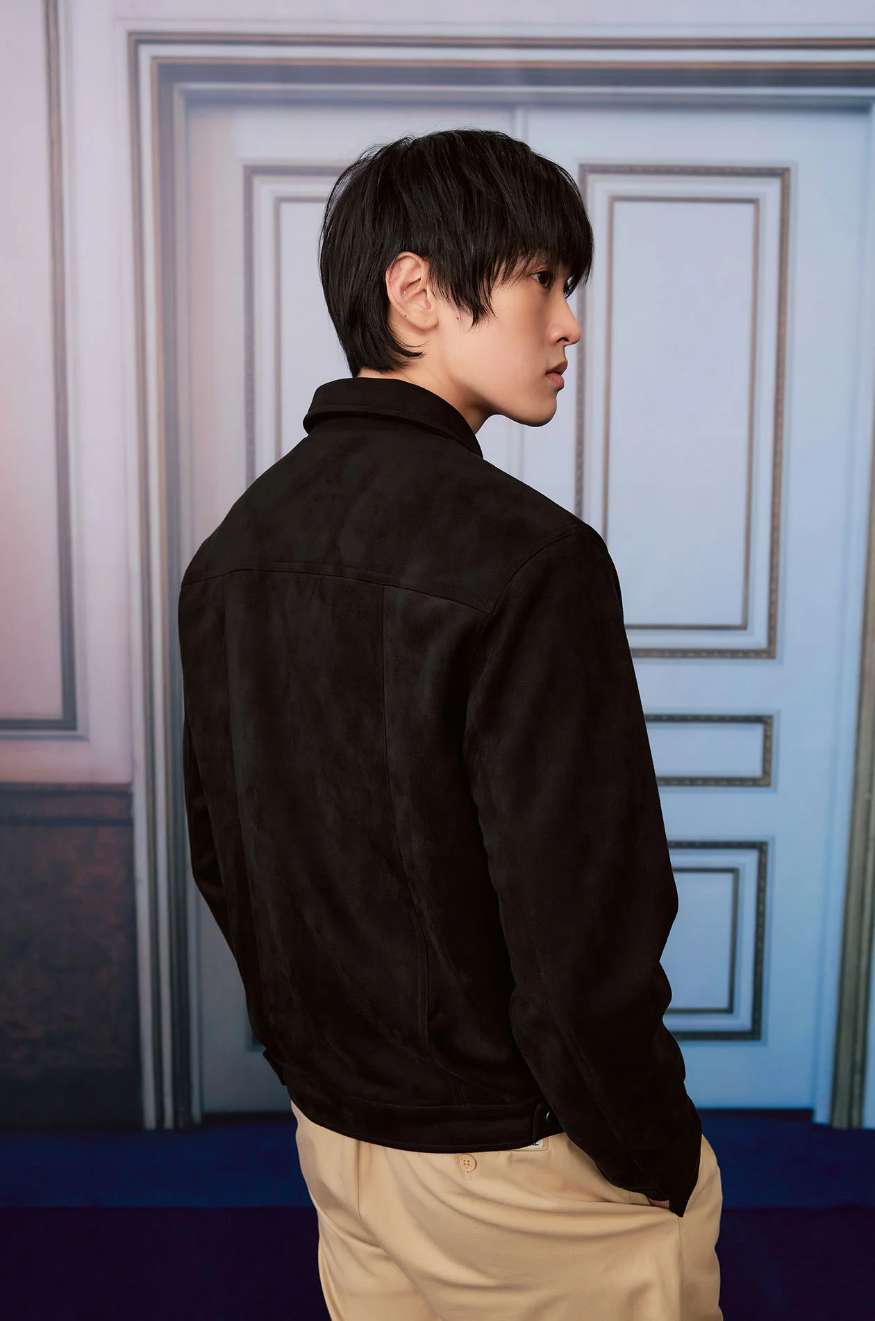 Long-sleeved jacket in faux suede. Regular fit with spread collar, chest pockets, and buttoned cuffs. Front button closure. Available in black.
