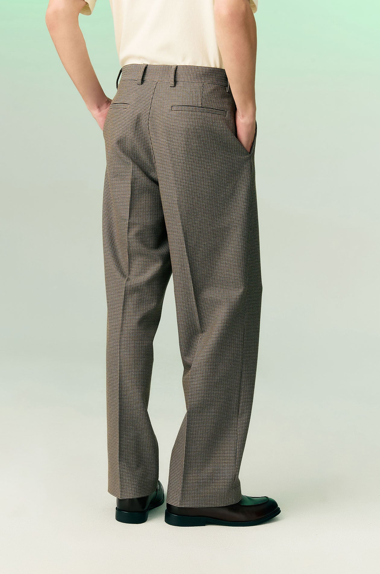 Mid-rise suit pants in suiting fabric with houndstooth pattern. Straight legs with front pleats, side and back pockets. Front hook and zip closure. Available in brown.