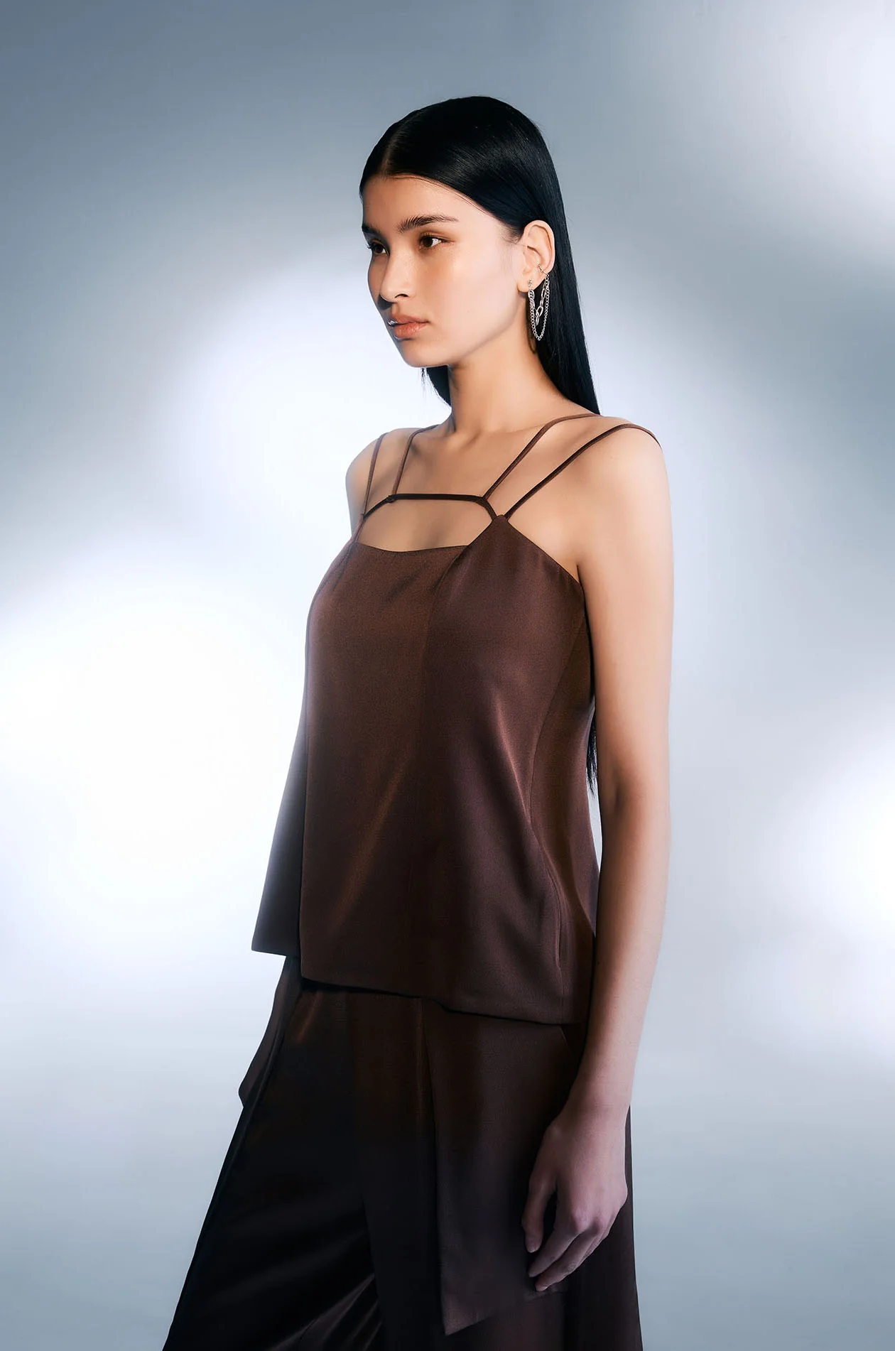 Jaspal X TunTunn | Strappy top in georgette fabric. Features a geometric strap configuration. Twin spaghetti shoulder straps converge into a horizontal chest band. Regular fit with tapered waistline. Pull-on style. Available in dark brown.