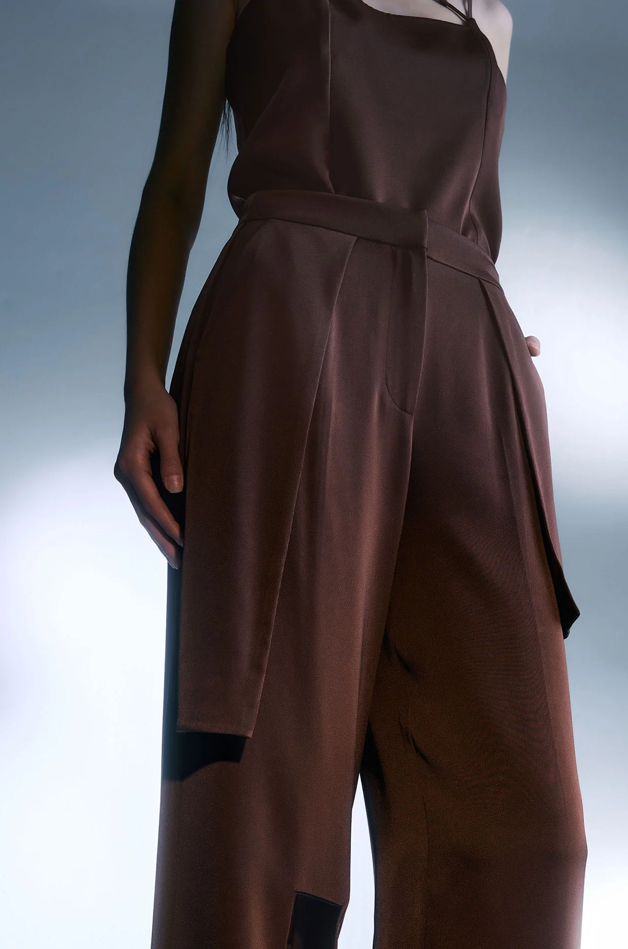 Jaspal X TunTunn | Mid-rise pants in woven fabric. Deconstructed design featuring slim-straight legs, side pockets, flap panels, and sheer panel at the hem. Front hook and zip closure. Available in dark brown.