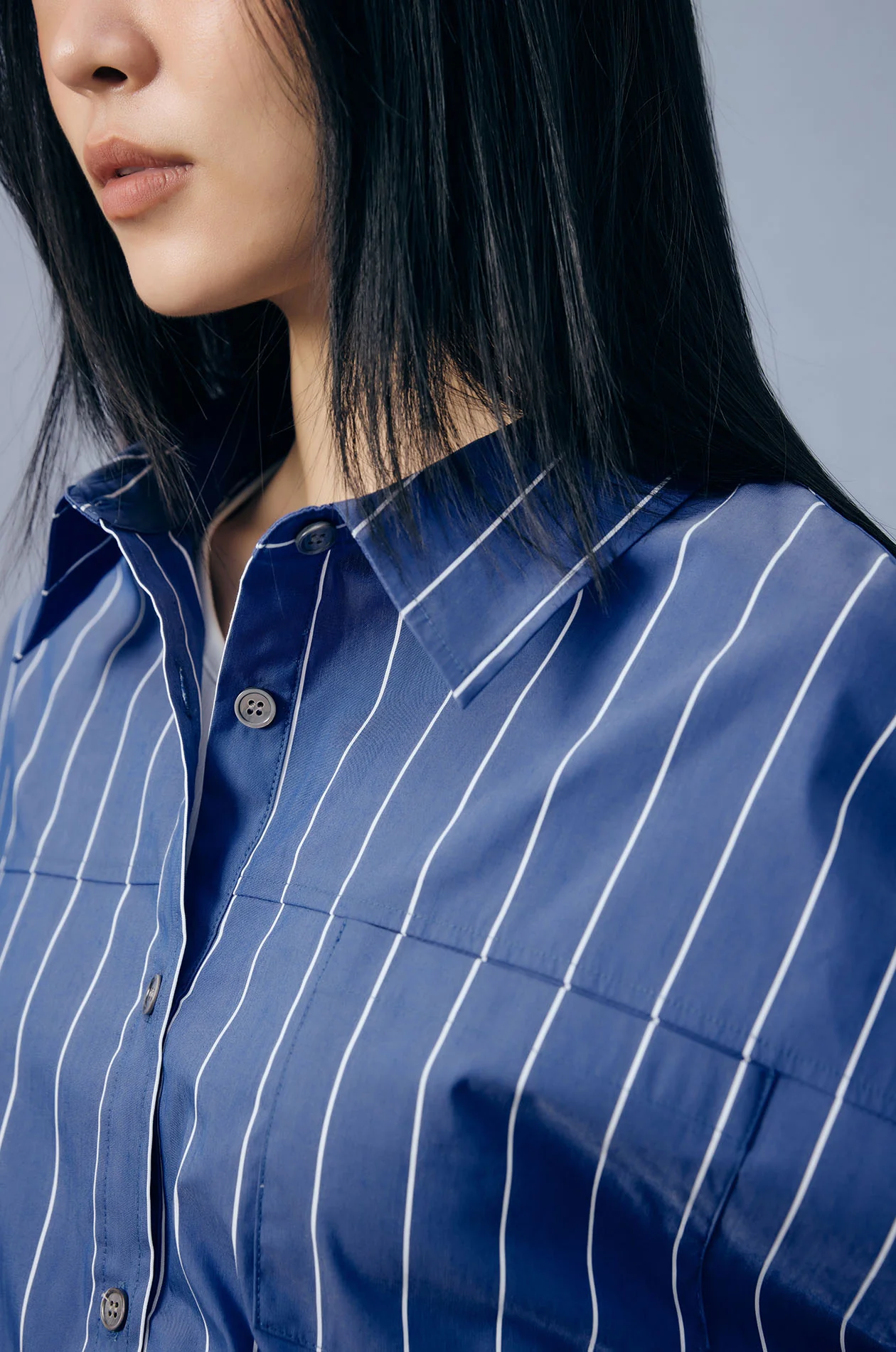 Long-sleeved shirt in poplin with stripes. Oversized fit with a classic collar, chest pocket, oversized cuffs, and fold-back detailing at the front hem. Attacched ribbed tank underlay. Front button closure. Available in white and blue.