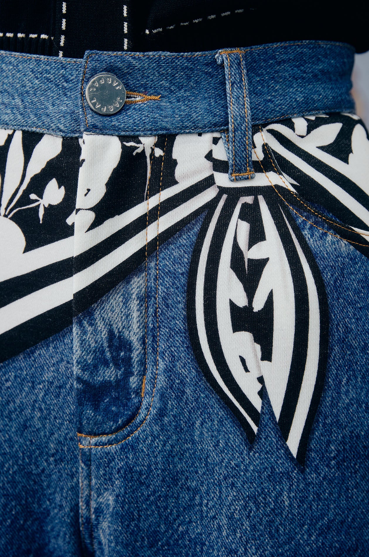 Mid-rise jeans in denim. Straight legs with five-pocket style and graphic tied-scarf print at the waistband. Front button and zip closure. Available in blue.