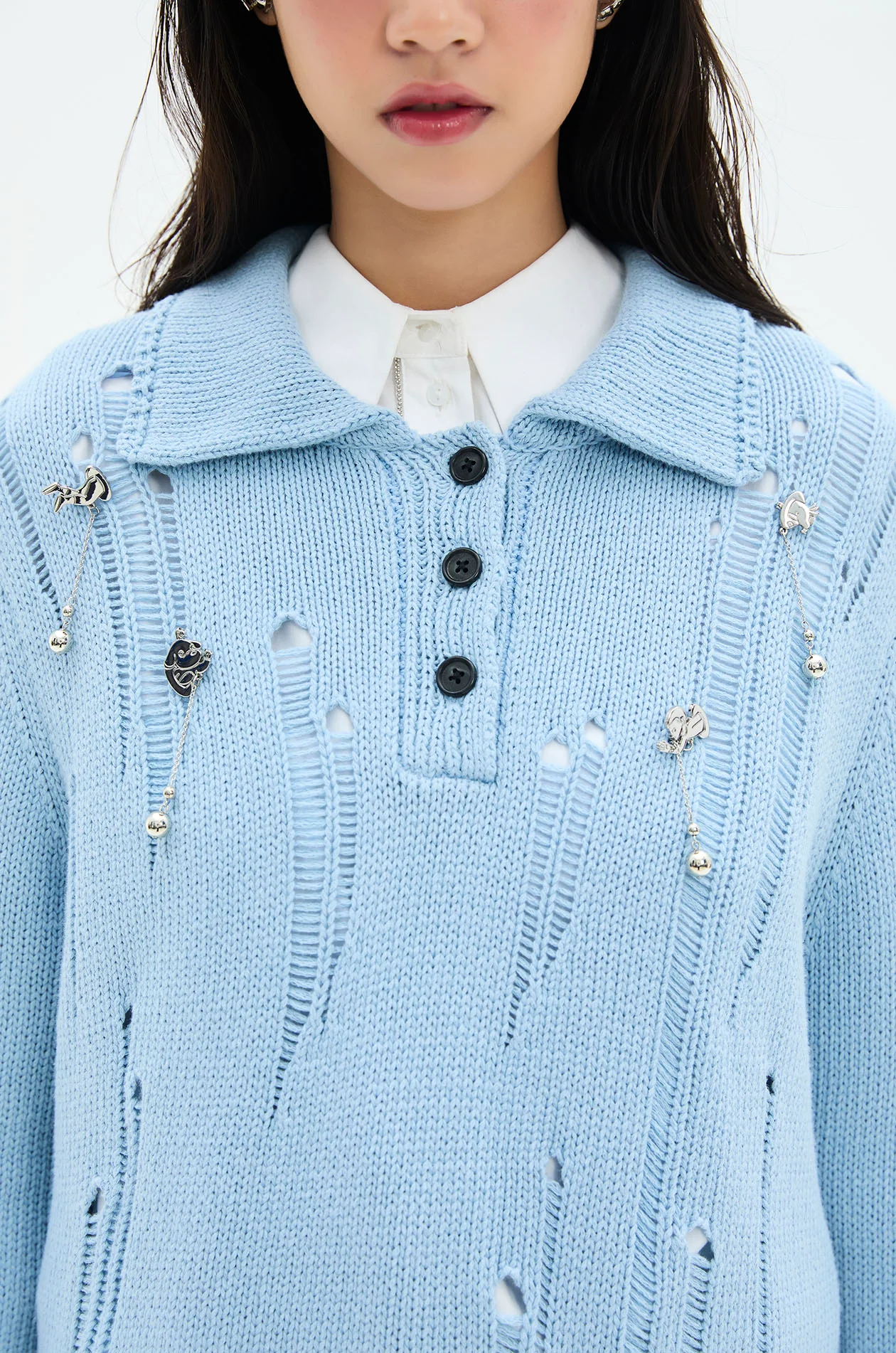 Gongkan x Jaspal | Long-sleeved sweater in knit fabric with spread collar. Designed with artful holes and distressed accents for a modern, worn-in feel. Elevated by metal brooches featuring Gongkan’s signature art, adding a bold, statement-making touch. Button closure. Available in blue.
