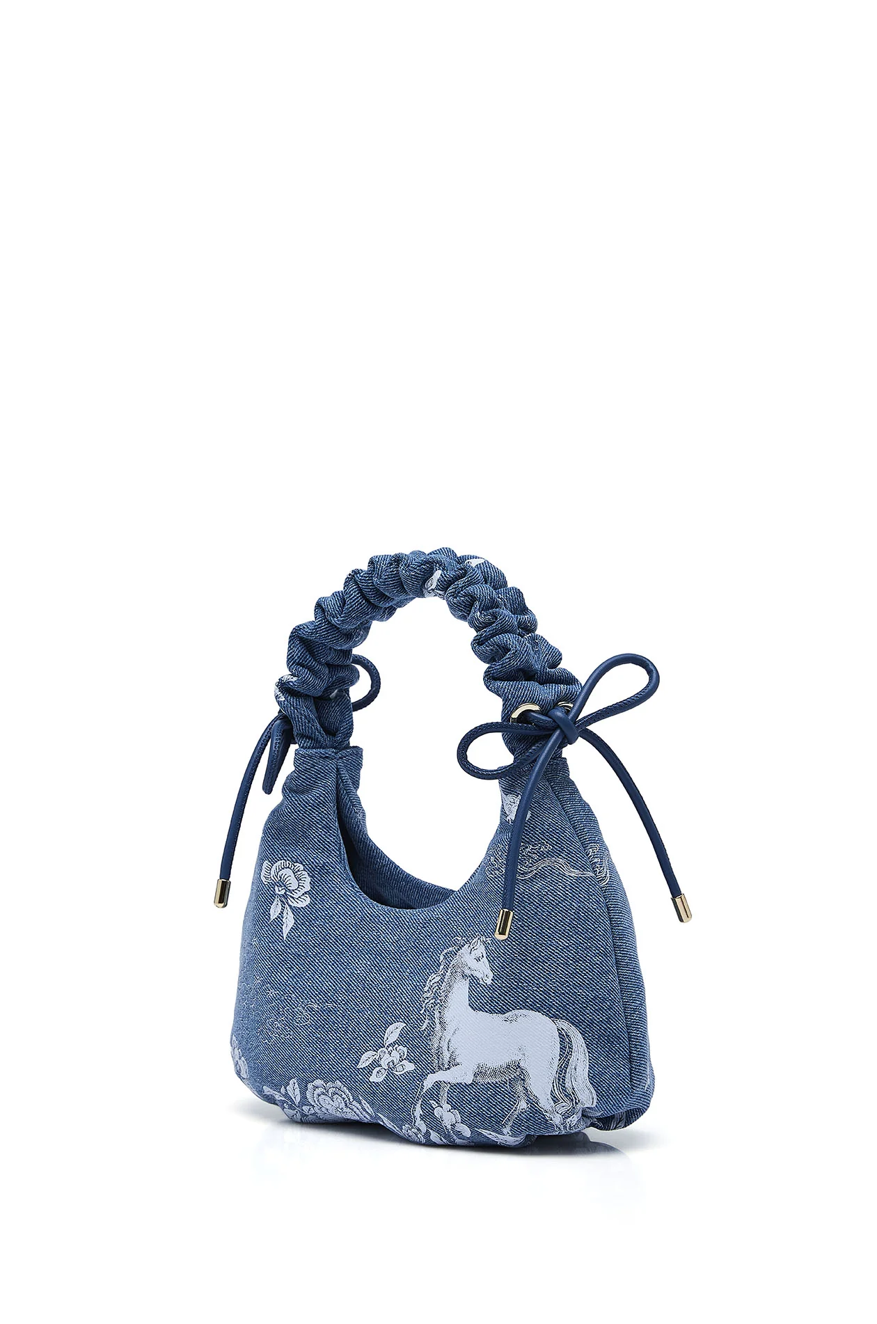 Jaspal x nussdaydream for Lunar New Year | Small top-handle handbag in denim featuring Auspicious motif print. Structured handle with ruched scrunchie detailing and ribbons. Available in blue.
