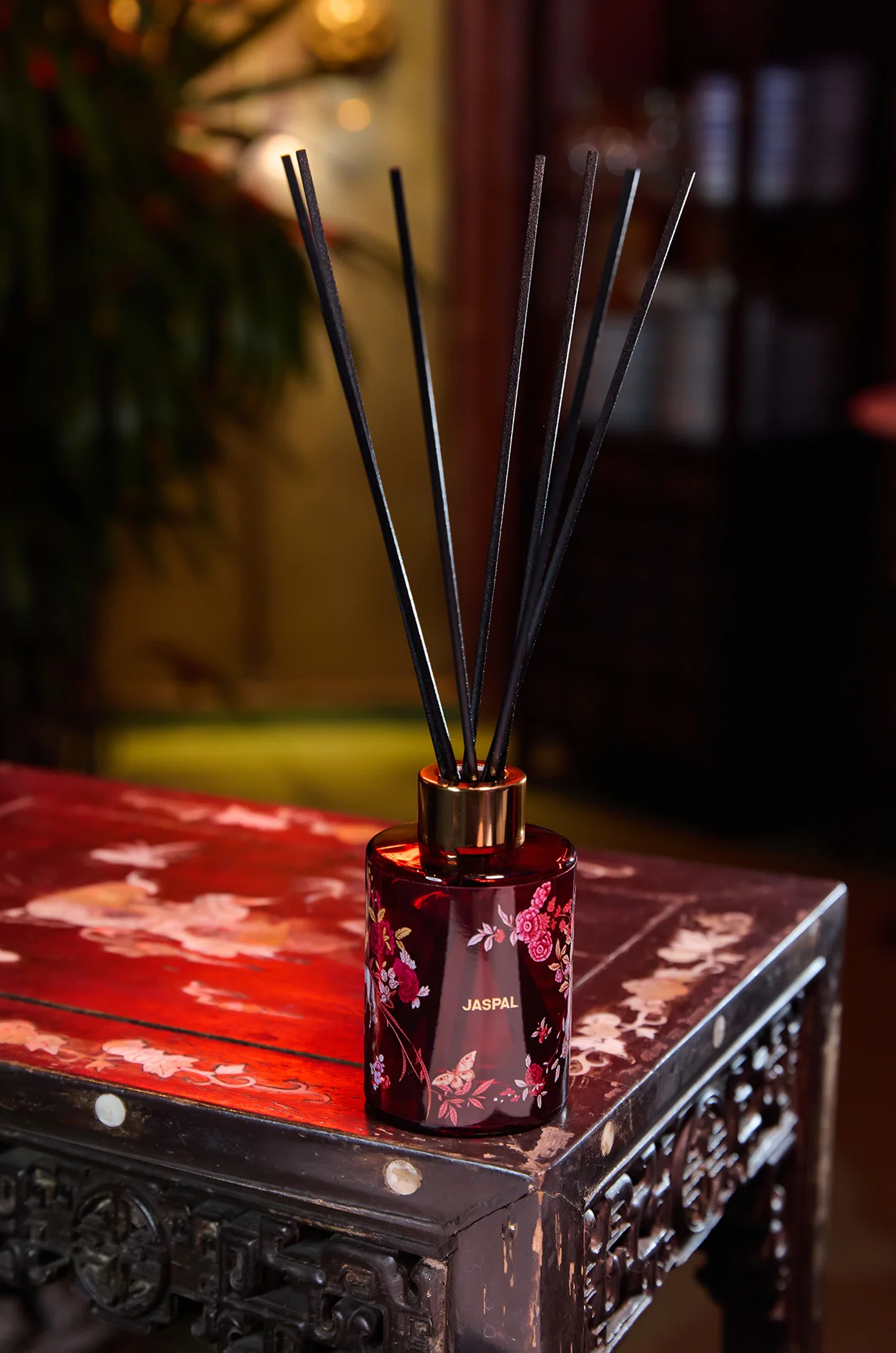 Jaspal x nussdaydream for Lunar New Year | A 100 ml aromatic reed diffuser that creates a peaceful and relaxing atmosphere with its wild berry and citrus scent. Presented in a decorative container printed with Patchwork Auspicious motifs, perfect for enhancing Lunar New Year-themed interiors. Available in Bloom Prosperity.