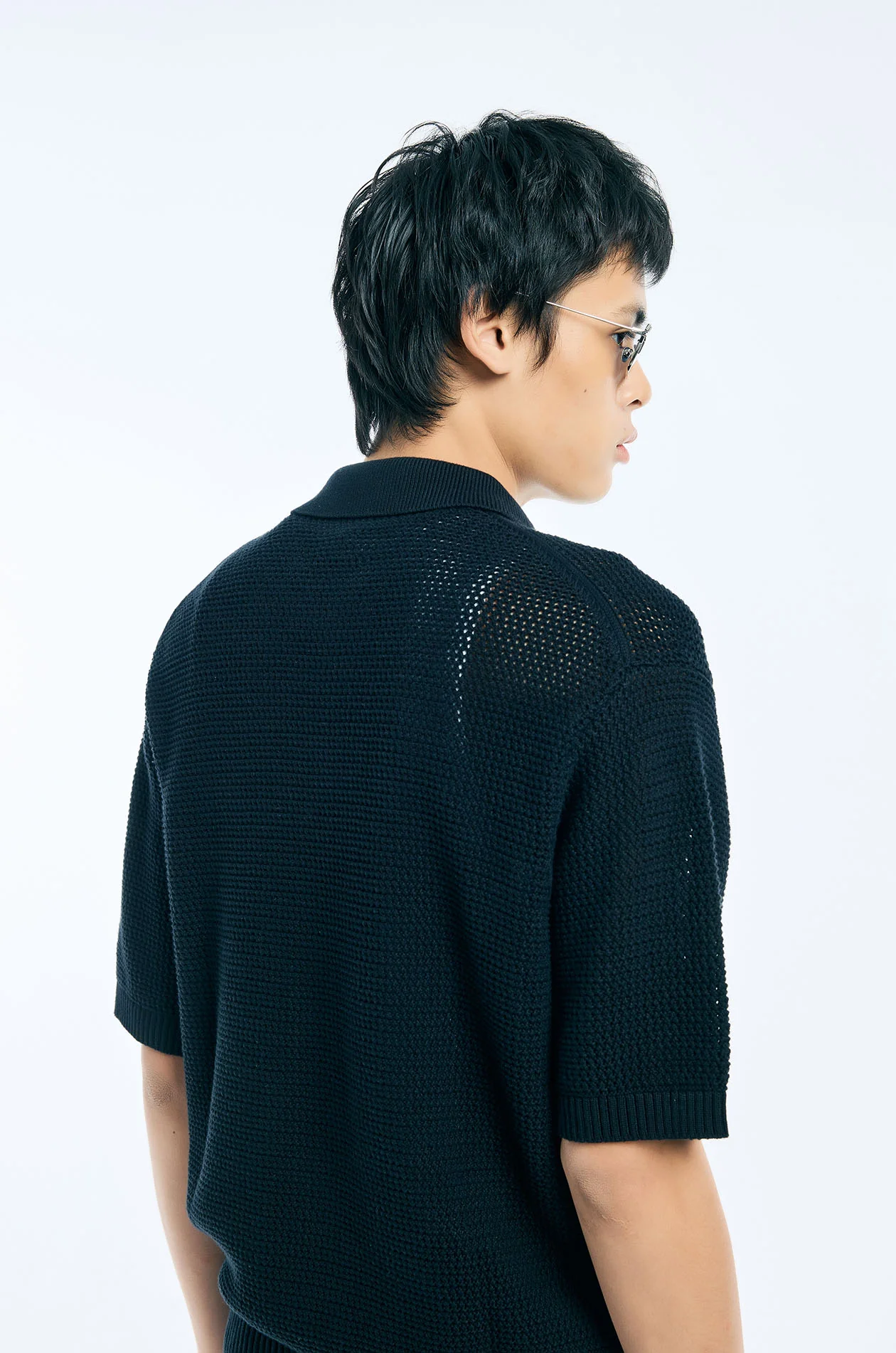 Short-sleeved shirt in knit fabric. Regular fit with classic collar and ribbed edges. Front zip closure. Available in black.
