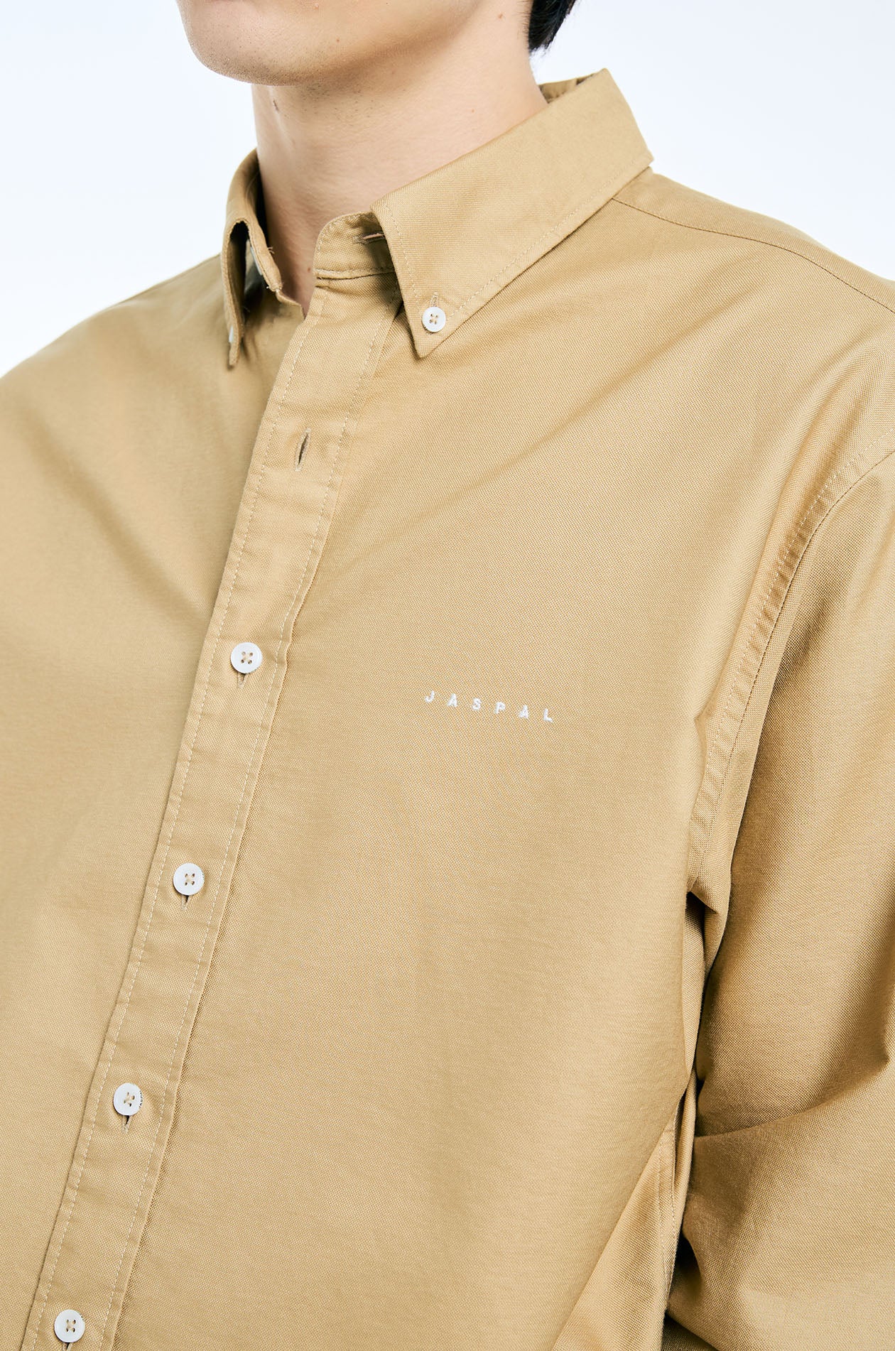 Long-sleeved shirt in oxford. Relaxed fit with button-down collar and Jaspal logo embroidery at the chest. Front button closure. Available in white and camel brown.