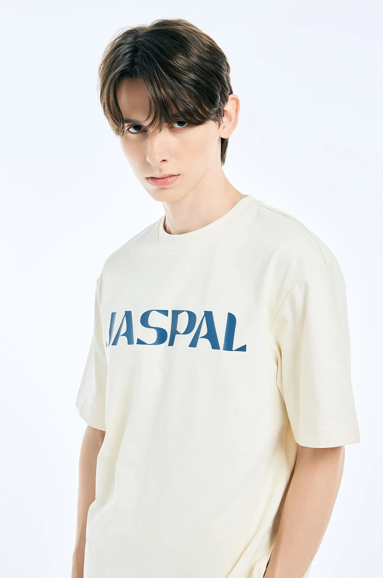 Short-sleeved T-shirt in jersey. Oversized fit with contrast Jaspal logo print and round neckline. Available in cream and dark blue.