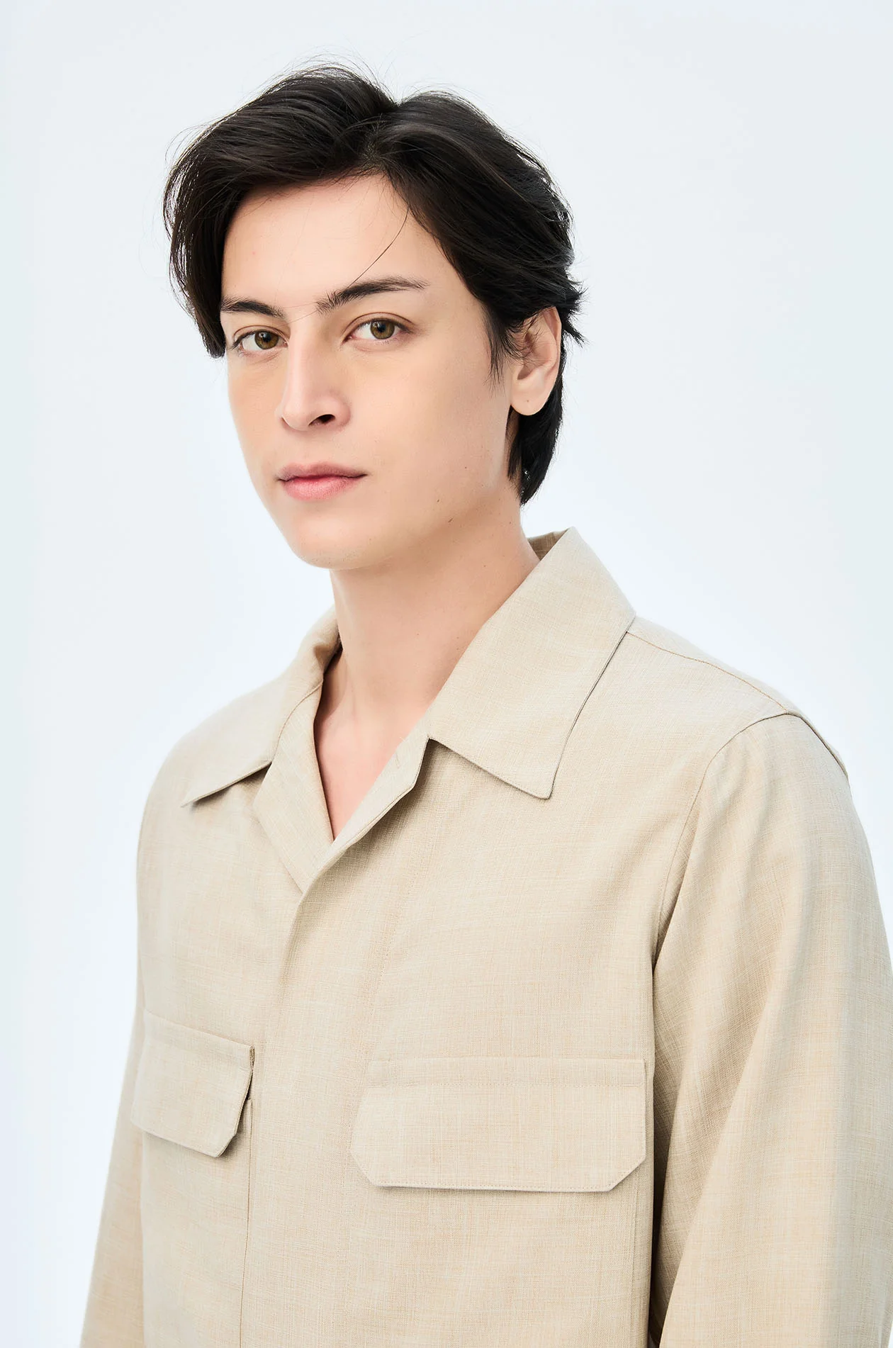 Long-sleeved lightweight blouson jacket in fine hopsack fabric. Regular fit with notched collar and chest pockets. Front button closure. Available in dark beige.