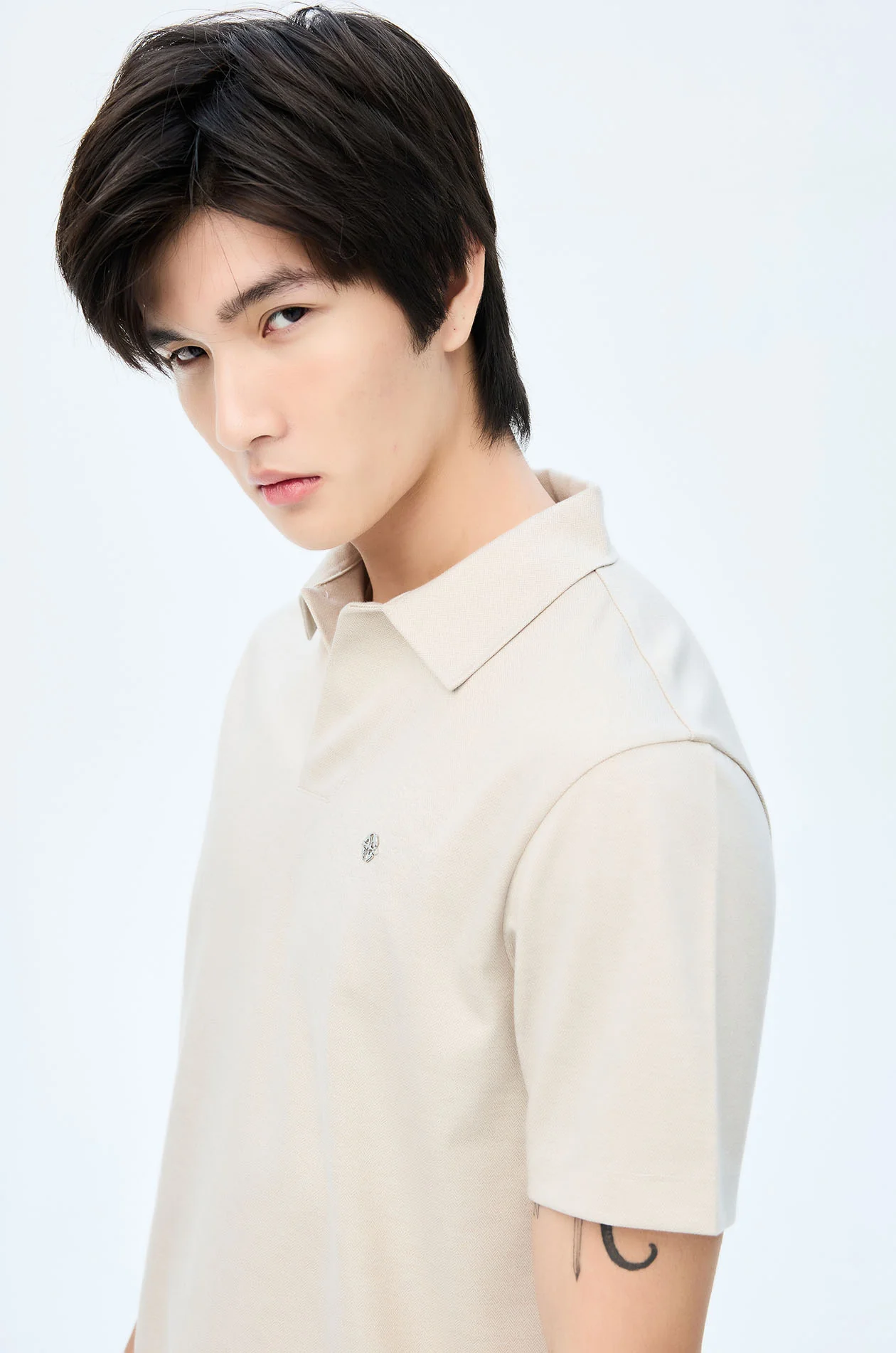 Short-sleeved polo shirt in herringbone jersey fabric. Regular fit with open collar and silver hardware at the chest. Available in black, white, and light beige.