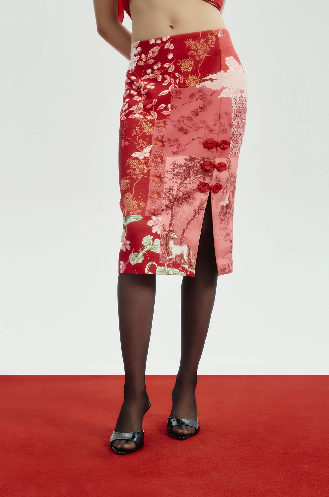 Jaspal x nussdaydream for Lunar New Year | Mid-rise midi skirt in crepe fabric. Pencil silhouette with patchwork auspicious motifs print. Cheongsam-inspired design with front slit with pankou knot button detail. Side zip closure. Available in Chinese Red.