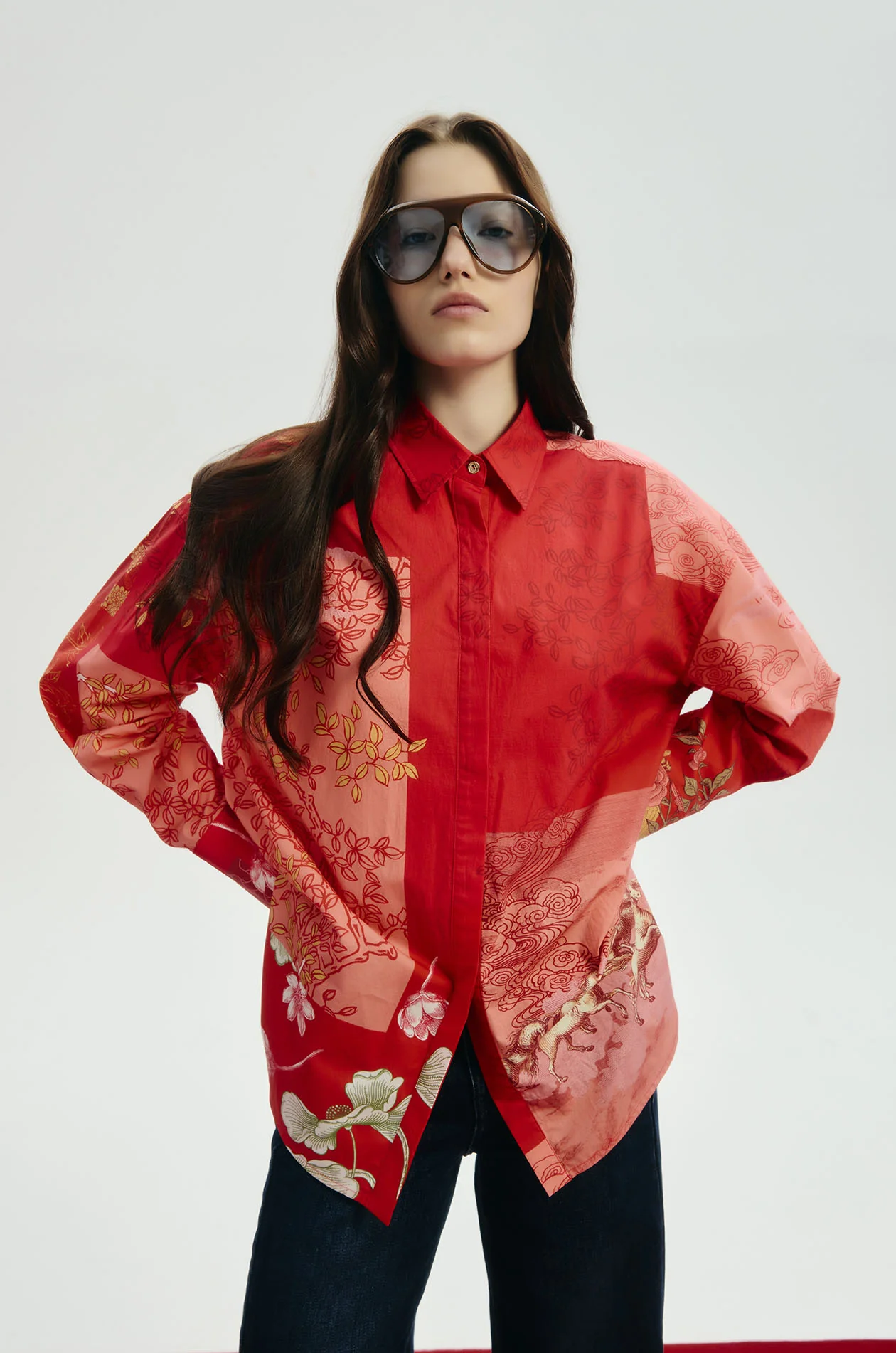 Jaspal x nussdaydream for Lunar New Year | Long-sleeved shirt in poplin. Oversized fit with patchwork auspicious motifs print and classic collar. Front button closure. Available in Chinese Red.