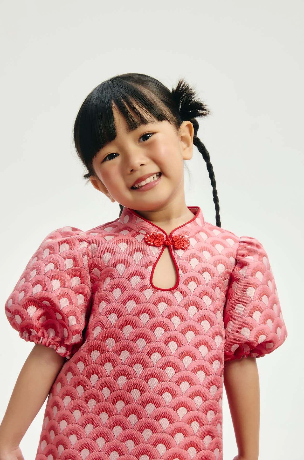 Jaspal x nussdaydream for Lunar New Year | Short-balloon-sleeved mini Qipao in jacquard with scales pattern. Shift silhouette with mandarin collar, pankou knot button detail, front cut-out accent, and elastic cuffs. Back zip closure. Available in Chinese Red.