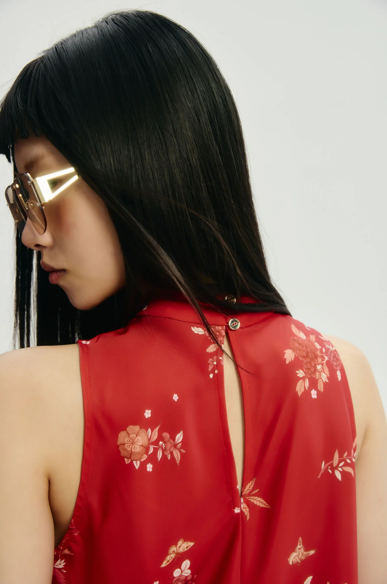 Jaspal x nussdaydream for Lunar New Year | Sleeveless top in satin. Chinese-style floral print. Mock neck and triangle hem. Split back neck with button closure. Available in Chinese Red.